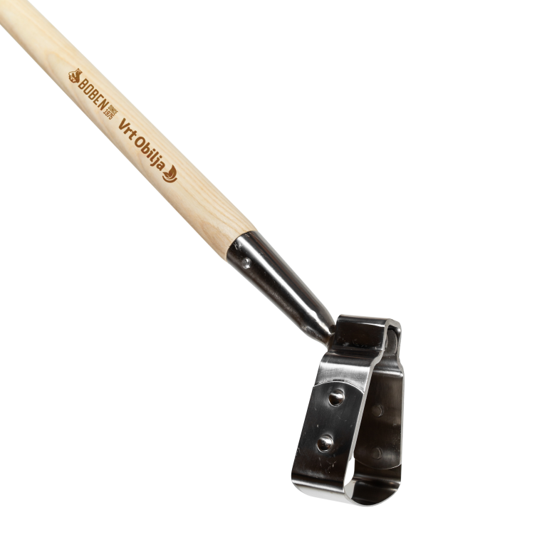 Rezilo in celotni kovinski del je izdelan iz nerjavečega jekla (rostfrei). Na materialu “ne šparamo”, orodje je zaradi tega izdelano robustno in deluje na vseh terenih. Nihajni člen je še dodatno ojačan in zdrži najtežje napore pri delu v trših tleh. Držalo je iz slovenskega jesenovega lesa, dodatno polakirano in prilagojeno, da sede v žensko in moško roko.
